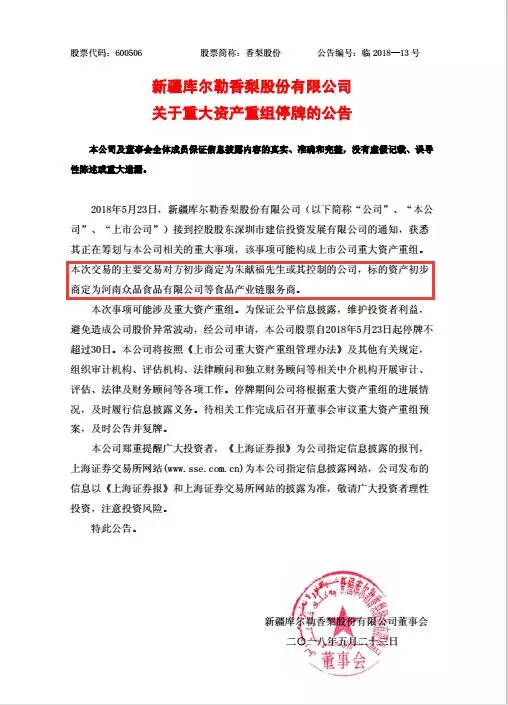 來源: 冷凍食品網 發布者:編輯5月23日晚,新疆庫爾勒香梨股份有限公司(簡稱“香梨股份”)公告稱因籌劃收購事項臨時停牌,收購標的初步確定為河南眾品食品有限公司(以下簡稱“眾品食品”)。