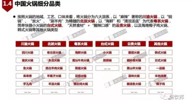 按照火鍋的地域、工藝、口味來看,將火鍋分為六大派系,川渝火鍋以“麻辣”著稱,北派火鍋以“銅鍋”、“炭火”和“涮羊肉”為特色。而粵系火鍋以“海鮮”和“清淡堂弟”為代表。還有簡單快捷小火鍋的臺式火鍋,以“酸辣口感”和“天然食材”為主打的“云貴火鍋”,以及海南椰子雞、韓式火鍋等其他類型。