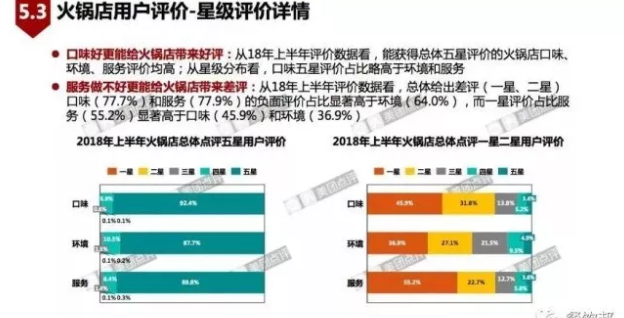 從大眾點評的數(shù)據(jù)看到,越來越多的火鍋用戶愿意分享就餐體驗。但火鍋店的整體評分降低,18年上半年較17年上半年五星評價占比減少7.2%,差評占比增加。