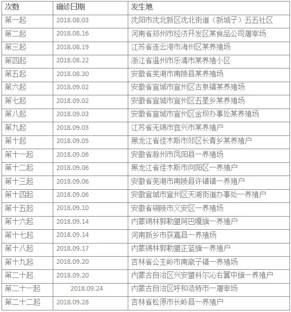 從2018年8月3日沈陽沈北確診的第一起非洲豬瘟到現在,一共發生了二十二起非洲豬瘟。隨后兩個月,非洲豬瘟便開始以點狀分布式在國內出現,其中安徽確診了八起,是迄今為止疫情發現最多的省份。