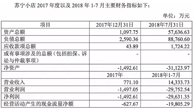 從其公告中披露出的最新業績來看,該筆增資對蘇寧小店十分重要。數據顯示,蘇寧小店2018年1至7月營收1.43億元,虧損2.96億元,債務高達6.53億元。股權轉讓的前提,即蘇寧易購清理掉此債務。此次將蘇寧小店業務剝離出上市公司,也是防止未來蘇寧小店擴張造成的虧損影響到上市公司的業績。