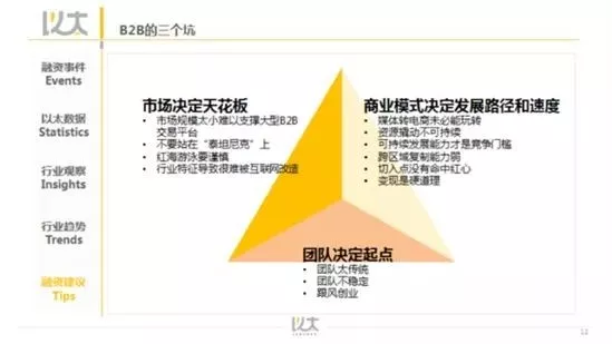 以太投資團隊曾經從3個維度,對B2B平臺通常面臨的問題(也就是常見的“坑”)做了總結,分別是市場/方向、團隊和商業模式。他們認為,B2B所在的市場決定了發展的天花板,團隊決定了起點,而商業模式決定了平臺發展的路徑和速度。這也是B2B平臺在尋求投資的過程中,最為投資人所看重的三個方面。