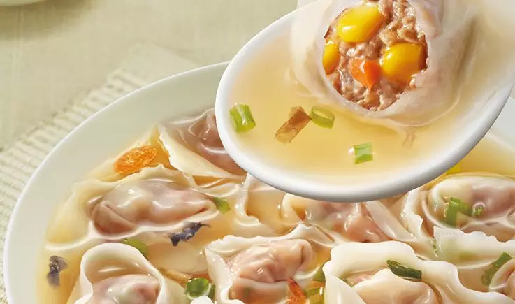 金牌蝦云吞屬于廣式云吞——普通云吞單顆重量一般在12g,廣式云吞單顆15g,為的就是“能包下一整只蝦”。不過,這款云吞產(chǎn)品的皮中加入了雞蛋,呈淡黃色,而非廣式云吞皮普遍加堿后呈現(xiàn)的黃色,口感更為爽滑。據(jù)悉,蝦仁云吞占據(jù)高端市場68%、中高端市場30%的份額。