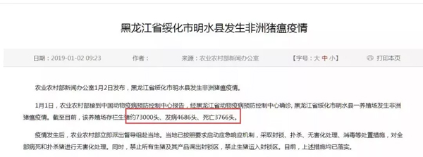 就在大家以為疫情趨緩之時,元旦過后第一天,2019年1月2日上午9點半,農業部發布了黑龍江省綏化市明水縣發生非洲豬瘟疫情,該養殖場存欄生豬約73000頭、發病4686頭、死亡3766頭。