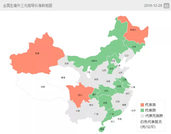 △豬e網統計的2018年12月28日全國生豬外三元指導價漲跌地圖
