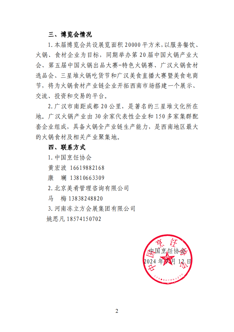 本屆博覽會(huì)共設(shè)展覽面積 20000平方米,以服務(wù)餐飲、火鍋、食材企業(yè)為目標(biāo),同期舉辦第20屆中國(guó)火鍋產(chǎn)業(yè)大會(huì)、第五屆中國(guó)火鍋出品大賽-特色火鍋賽、廣漢火鍋食材選品會(huì)、三星堆火鍋吃貨節(jié)和廣漢美食直播大賽暨美食電商節(jié),將為火鍋食材產(chǎn)業(yè)鏈企業(yè)開(kāi)拓西南市場(chǎng)搭建一個(gè)展示、交流、投資和交易的平臺(tái)。