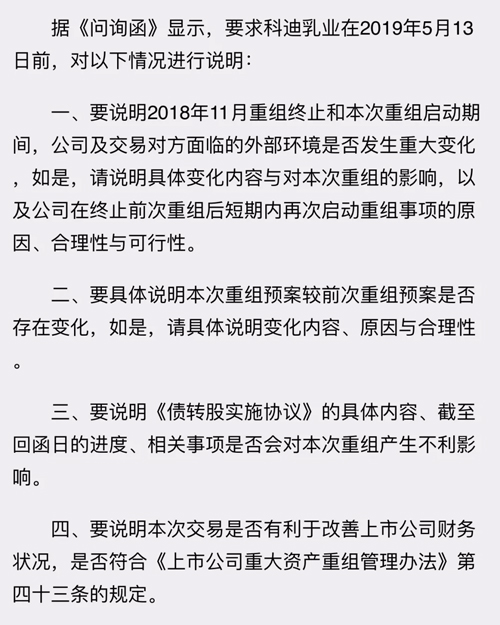 科迪乳業短時間內終止再啟動重組,引來深交所的注意。5月6日,深交所詢問本次重組的合理性,以及中原資產與科迪集團債轉股事項是否對重組造成不利影響等。