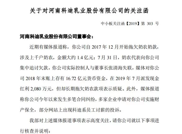 8月3日,在風口浪尖上的科迪乳業收到深圳證券交易所中小板關注函,要求其就媒體報道的科迪乳業拖欠奶農奶款、公司貨幣資金、合同糾紛等問題進行說明,并要求2019年8月9日前回復。