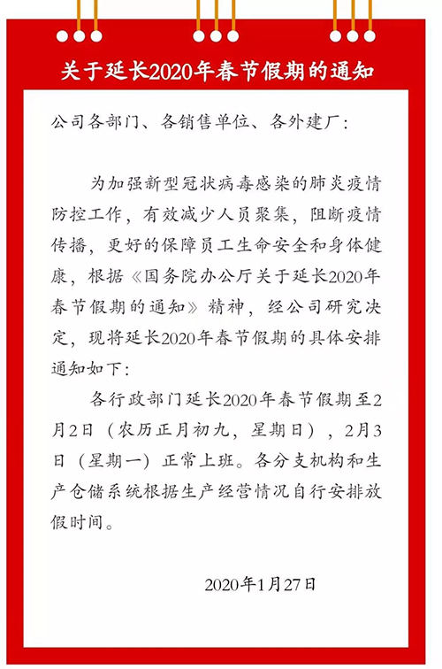 昨日,思念食品通過鄭州思念微信公眾號發(fā)出通知,表示,將延長2020年春節(jié)假期至2月2日。