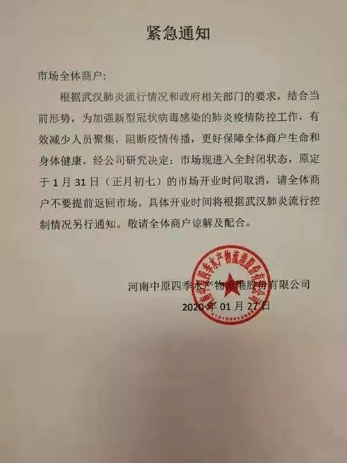 河南中原四季水產(chǎn)物流港也在昨天發(fā)布緊急通知,延期開市。
