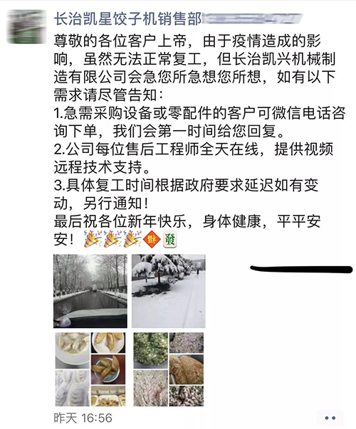 一些設(shè)備企業(yè)雖然暫時(shí)不能恢復(fù)生產(chǎn),但開(kāi)始了線上辦公,紛紛發(fā)圈表示:公司技術(shù)人員、售后人員提供視頻遠(yuǎn)程技術(shù)支持,也是棒棒噠!