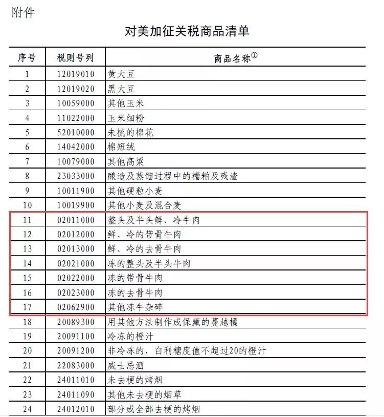 當(dāng)天,根據(jù)《中華人民共和國對外貿(mào)易法》和中華人民共和國進(jìn)出口條例相關(guān)規(guī)定,及經(jīng)國務(wù)院批準(zhǔn),國務(wù)院關(guān)稅稅則委員會決定,對原產(chǎn)于美國的大豆、汽車和牛肉等14類106項商品加征25%關(guān)稅。