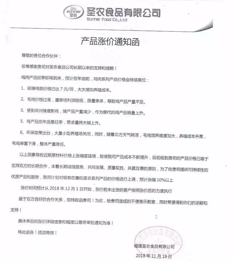 白羽雞上市公司圣農食品發布了漲價通知,稱因受到非洲豬瘟影響,豬產品產量減少,作為替代品的雞產品銷量上升;與此同時,大量小型養殖場因環保原因關閉、加上北方天氣轉涼、養殖成本升高,造成了整體毛雞產量變低。“計劃對現有在售的圣農系列產品價格上調10%以上。”